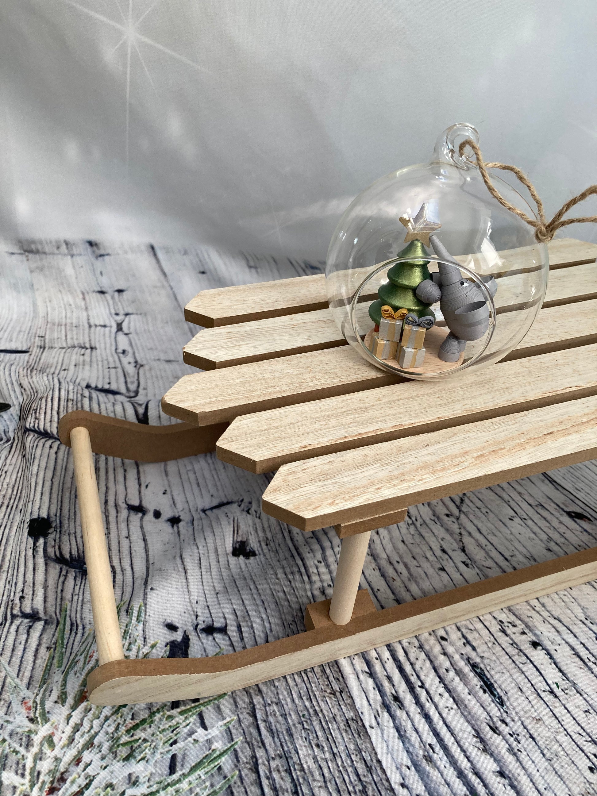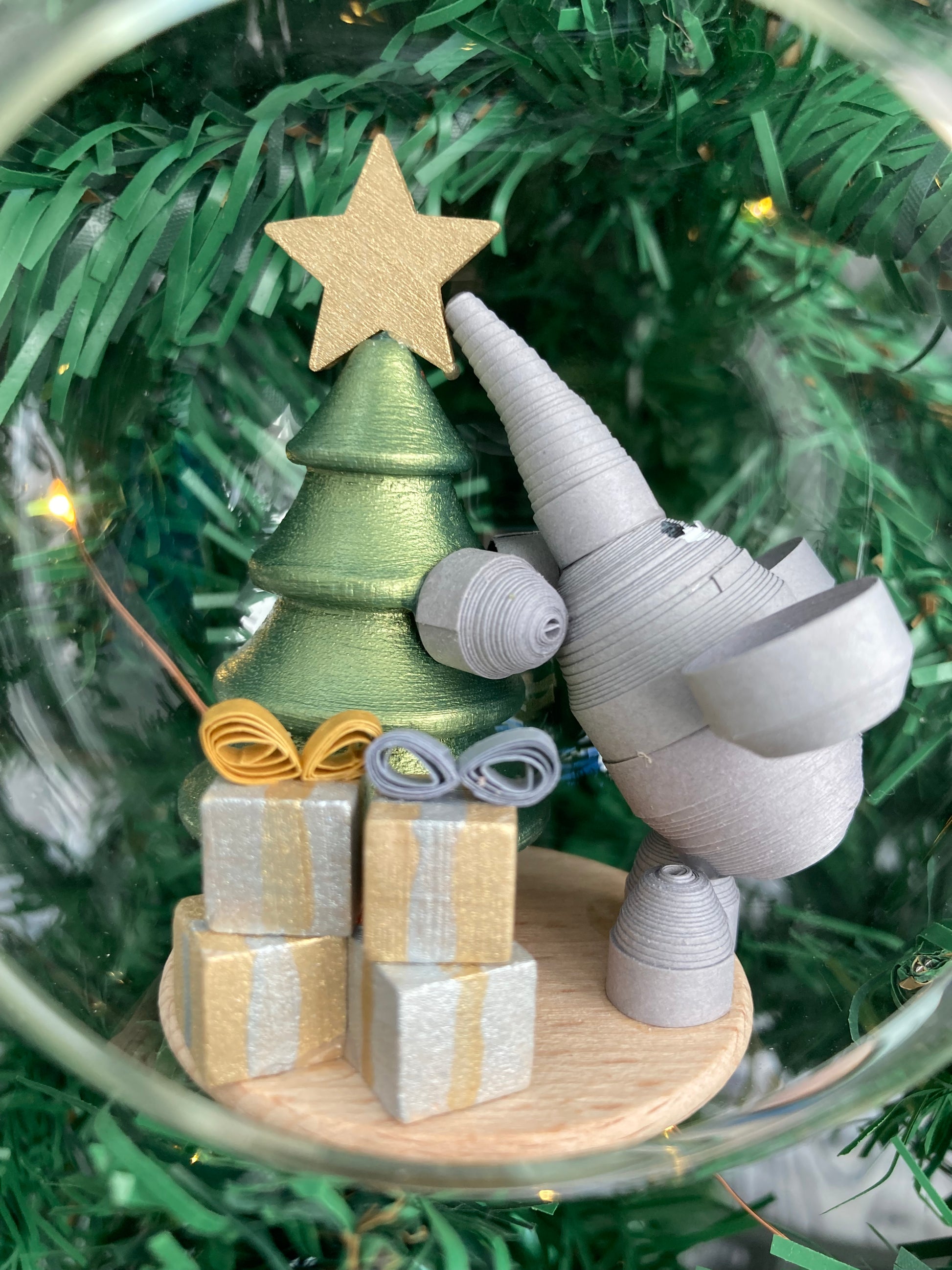 this lovely large bauble contains a tree with an elephant putting the star on the top and some presents at the bottom