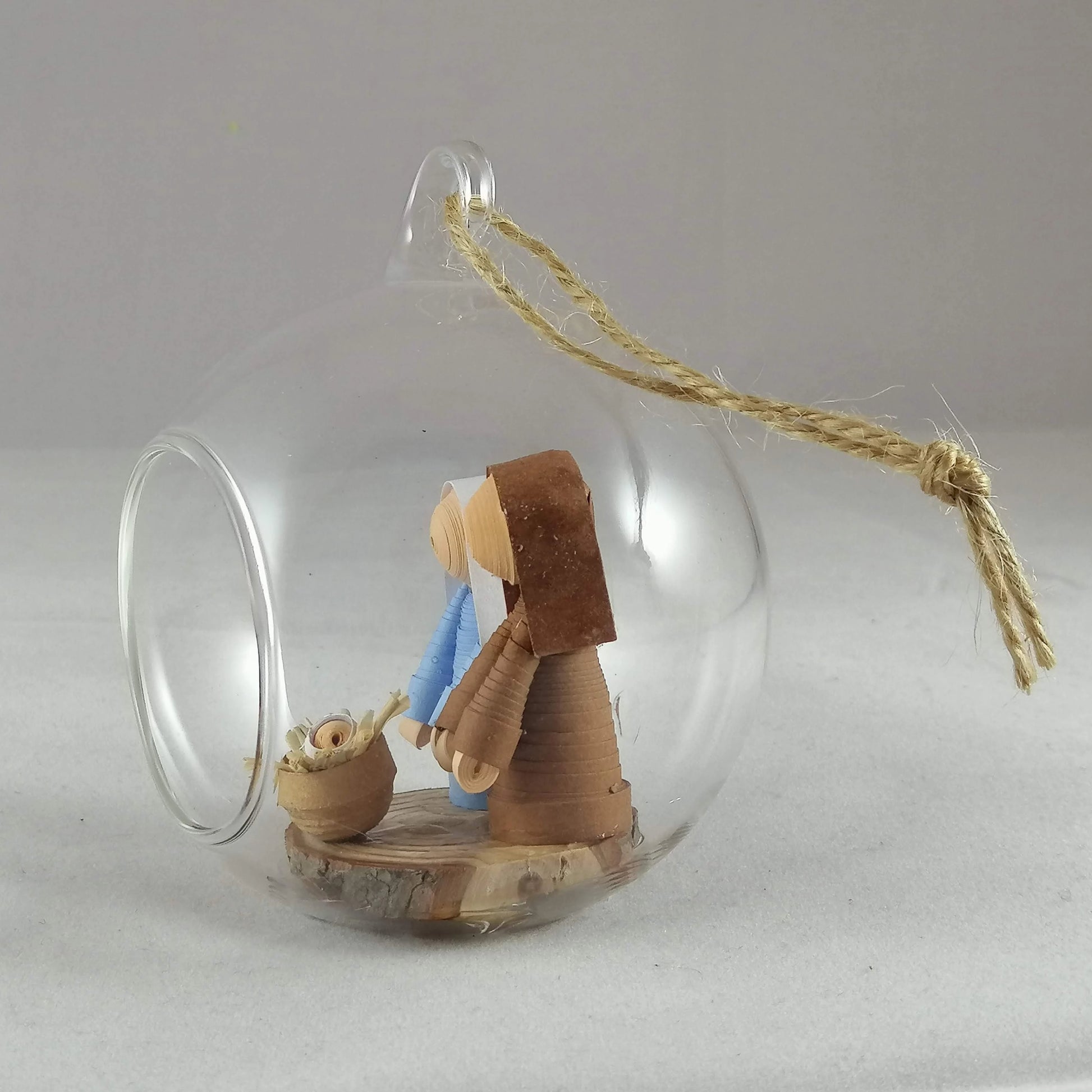 A lovely handmade nativity scene bauble with Mary, Joseph and baby Jesus in a glass bauble