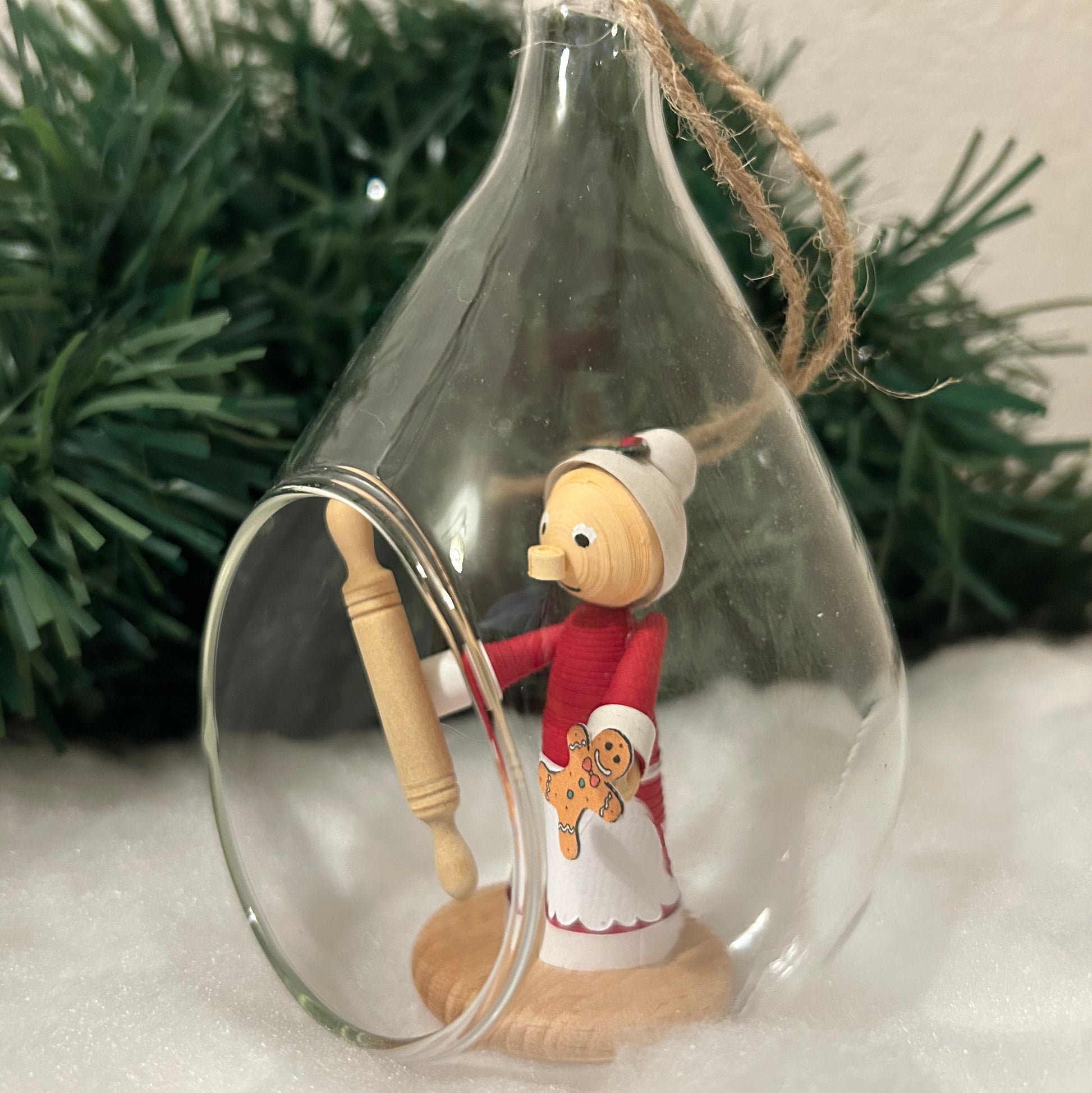 A lovely teardrop shaped bauble approx 9cm wide featuring Mrs Claus baking gingerbread men