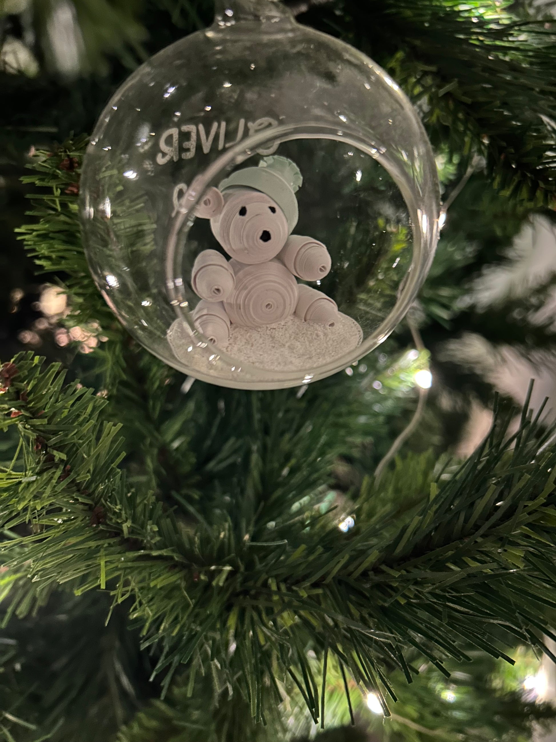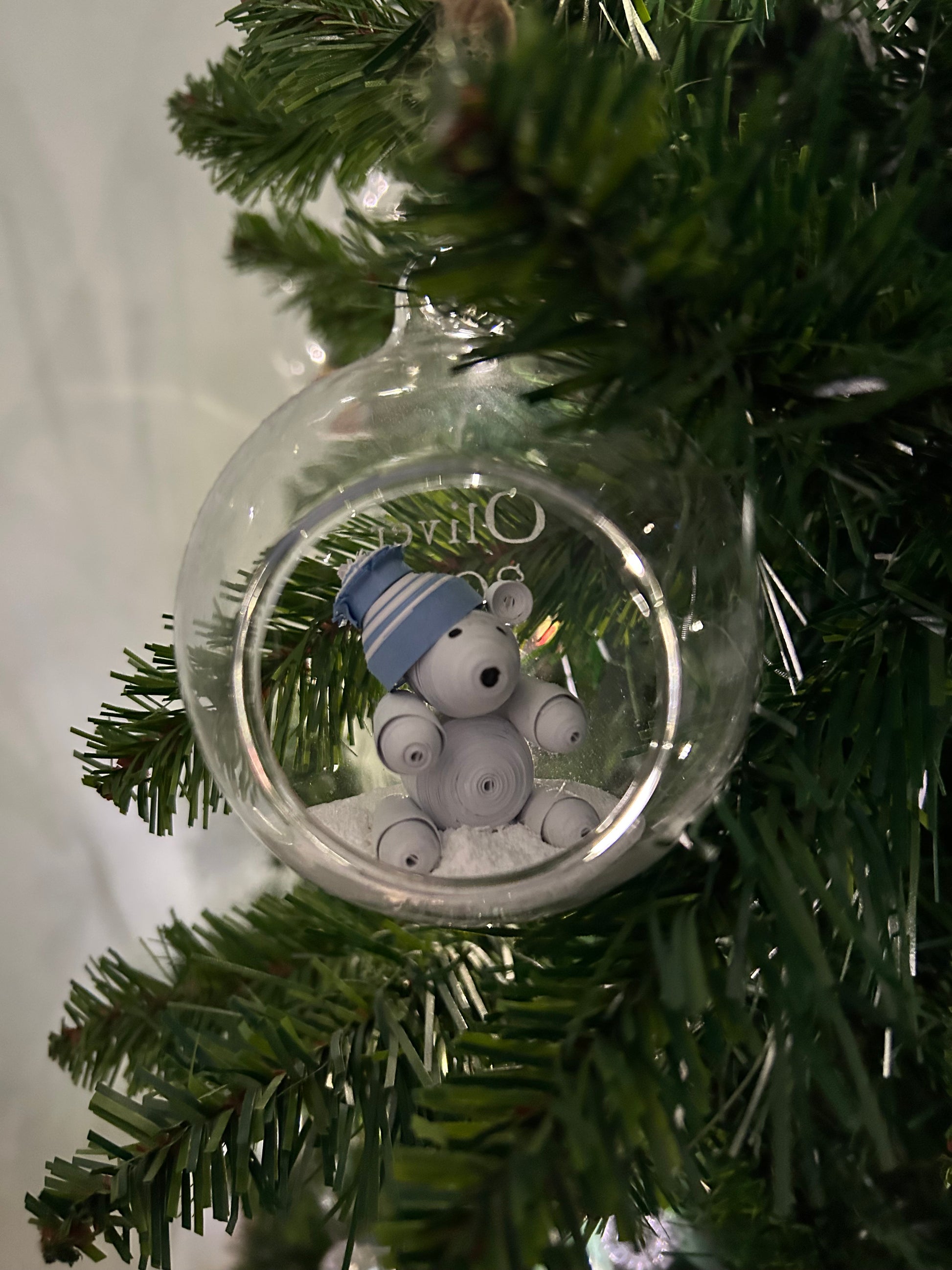 A glass bauble with a handmade polar bear