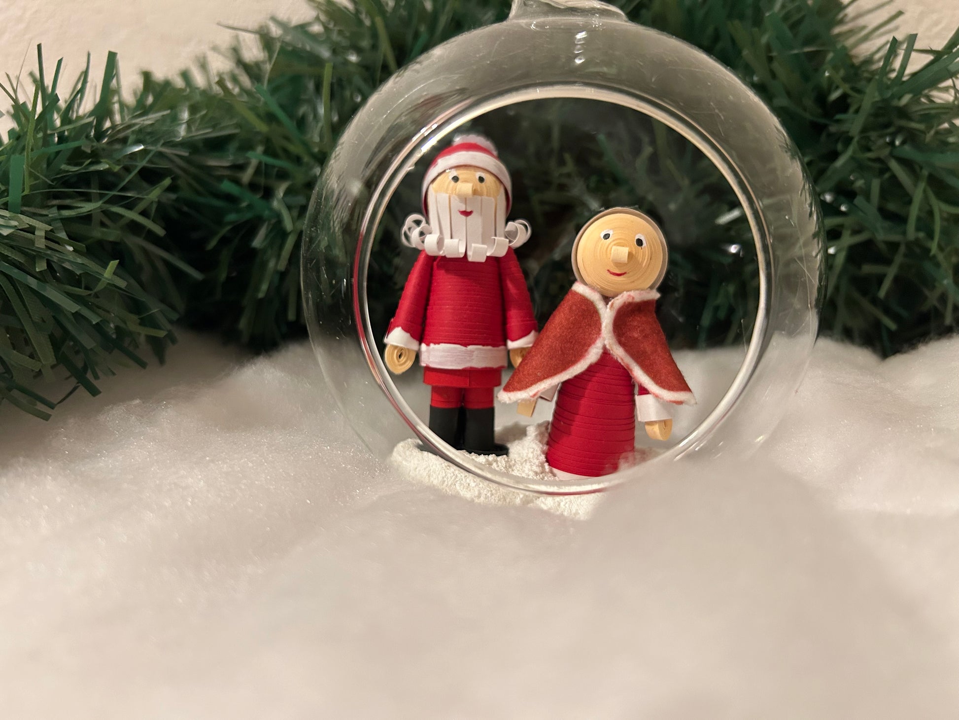 A 12cm glass bauble with hand quilled figures of Santa and Mrs Claus