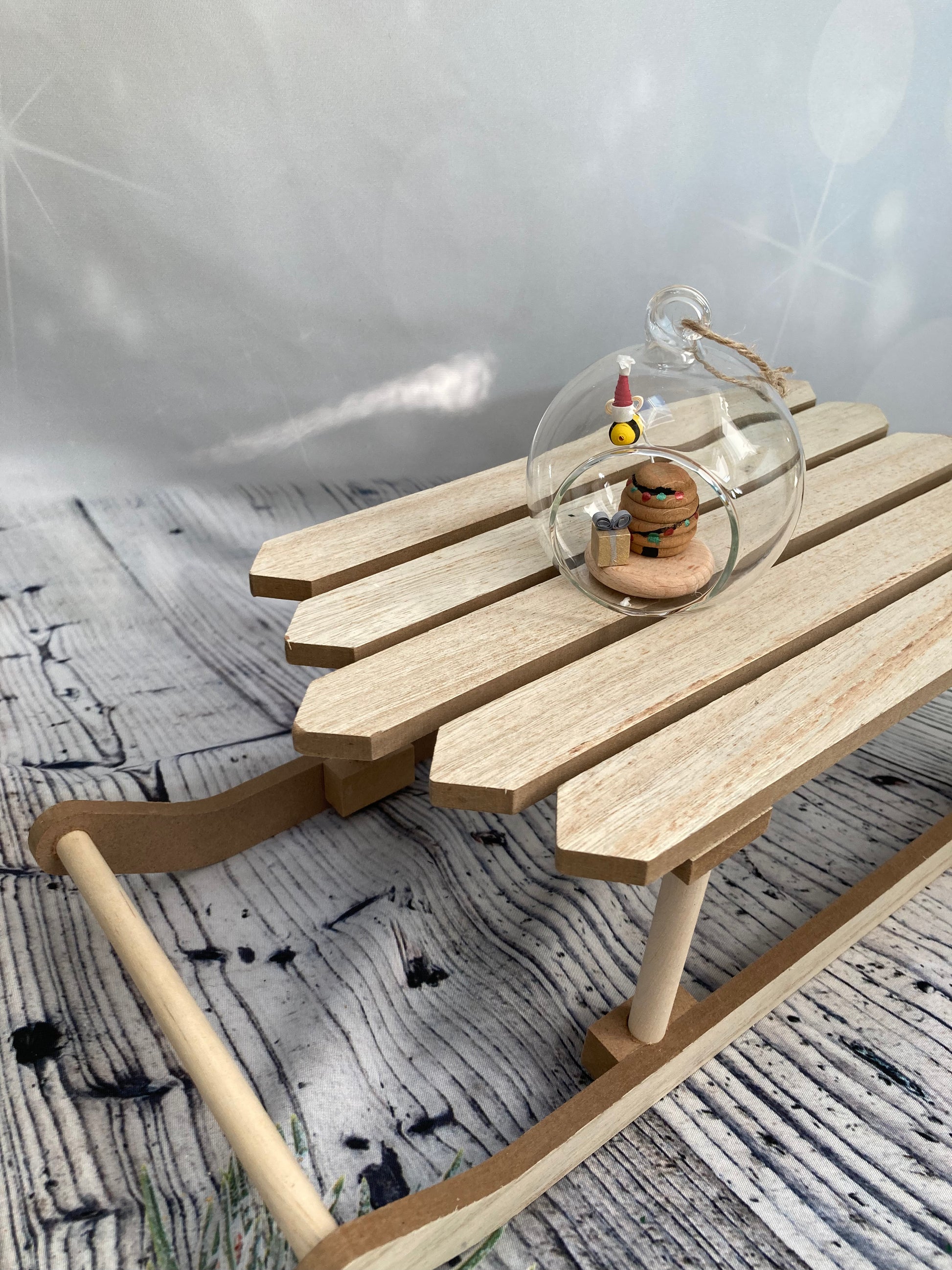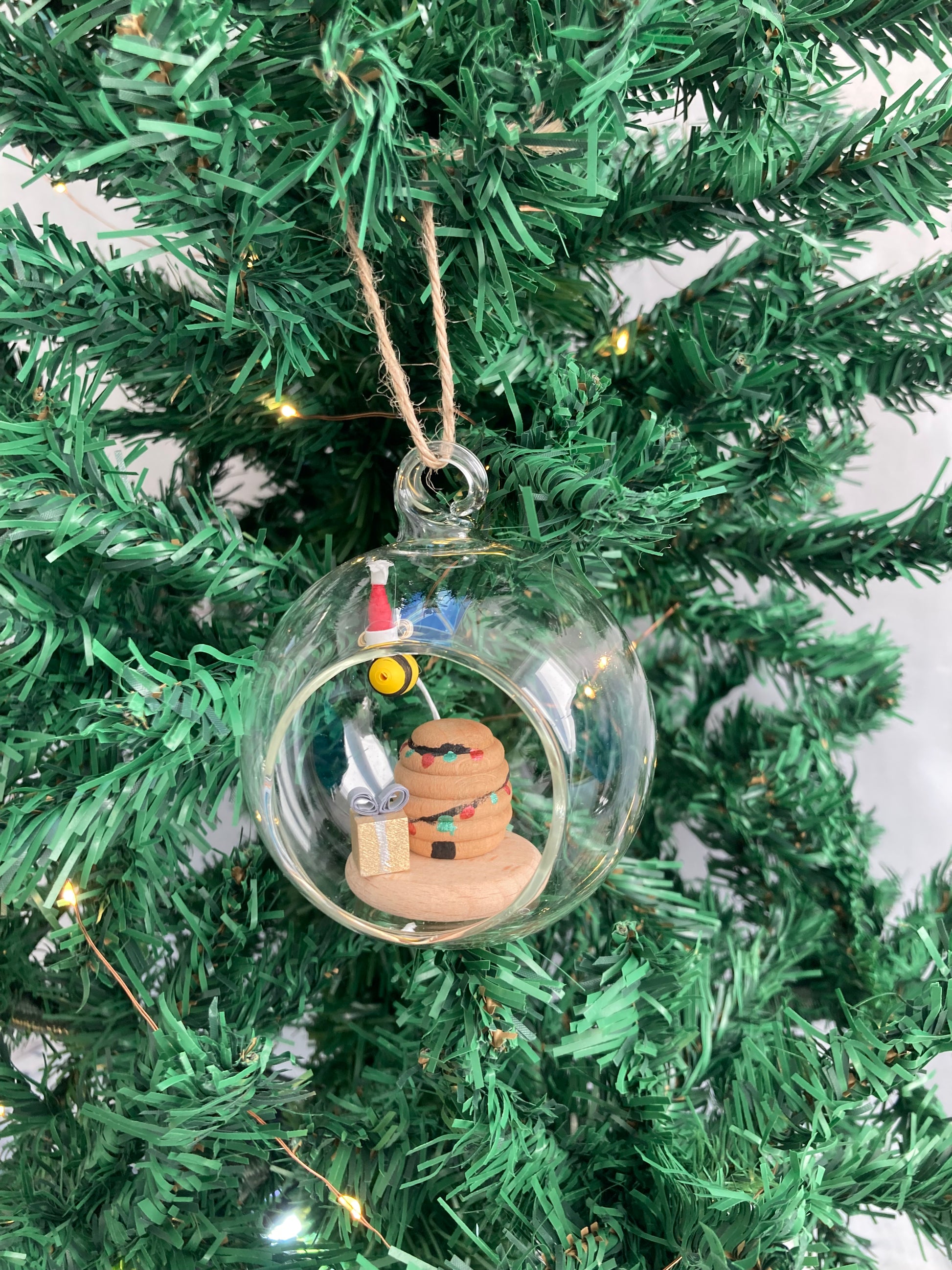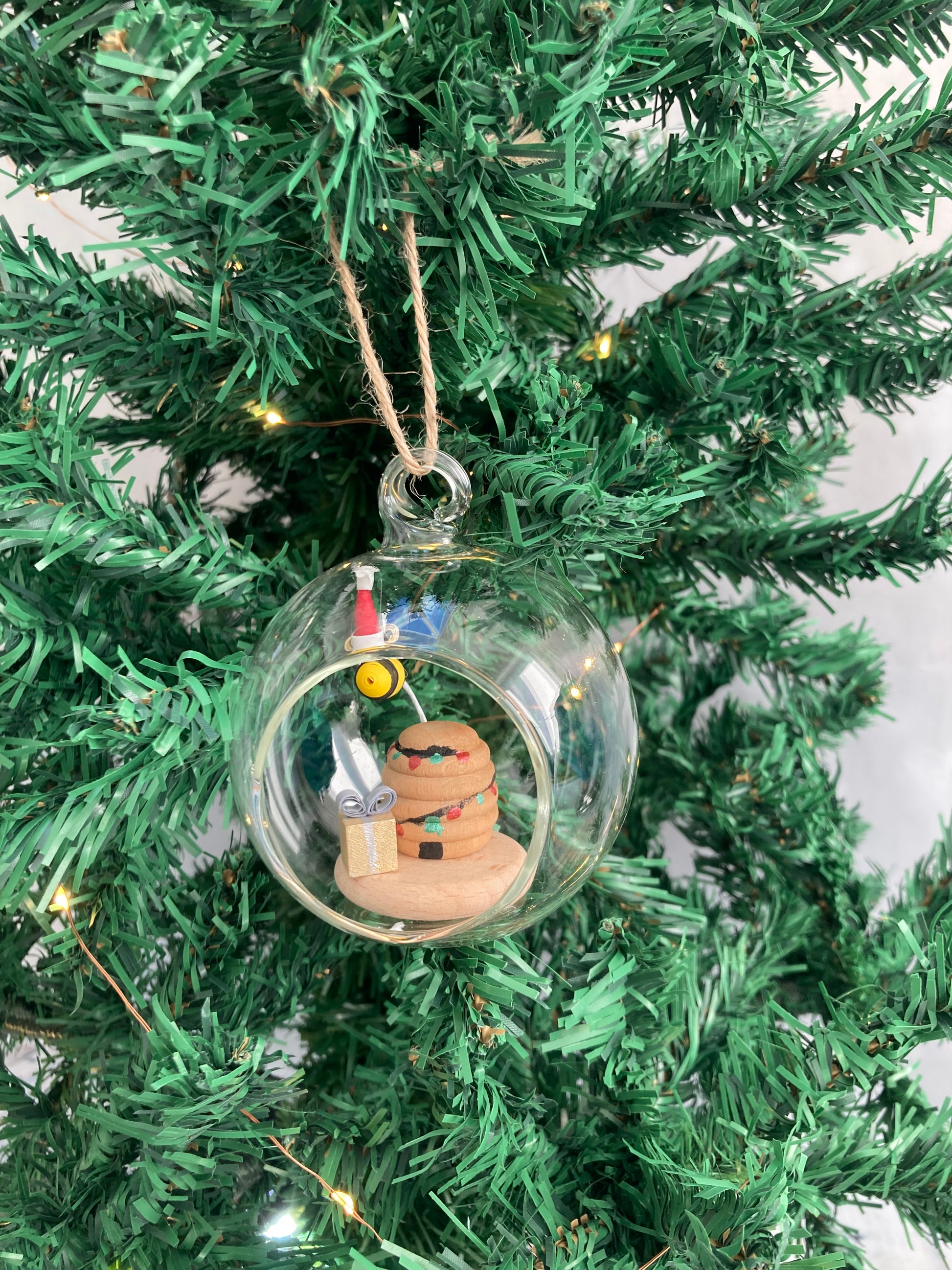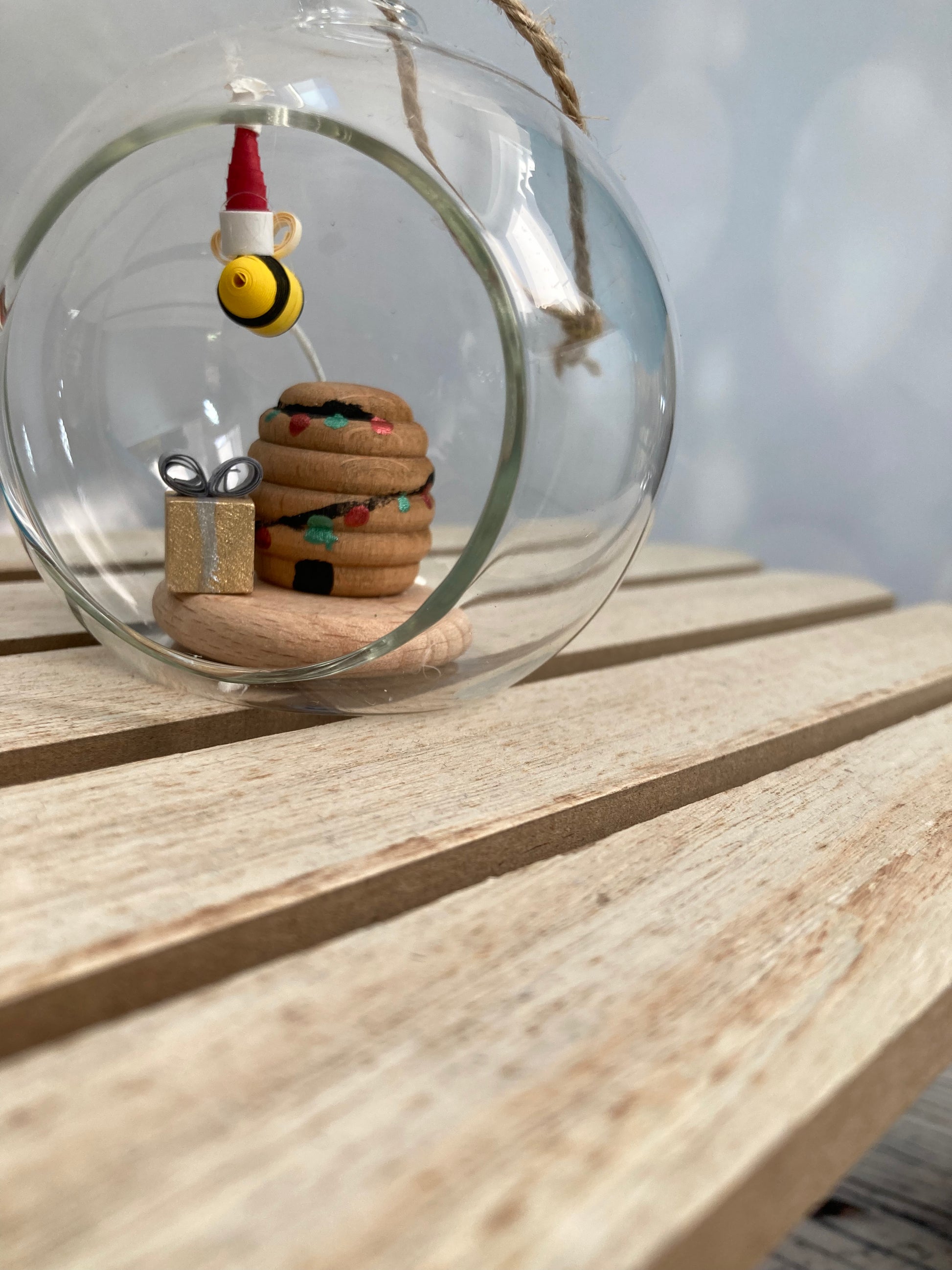 A lovely handmade bee wearing a Santa hat delivering a present to a decorated bee hive in a lovely glass bauble