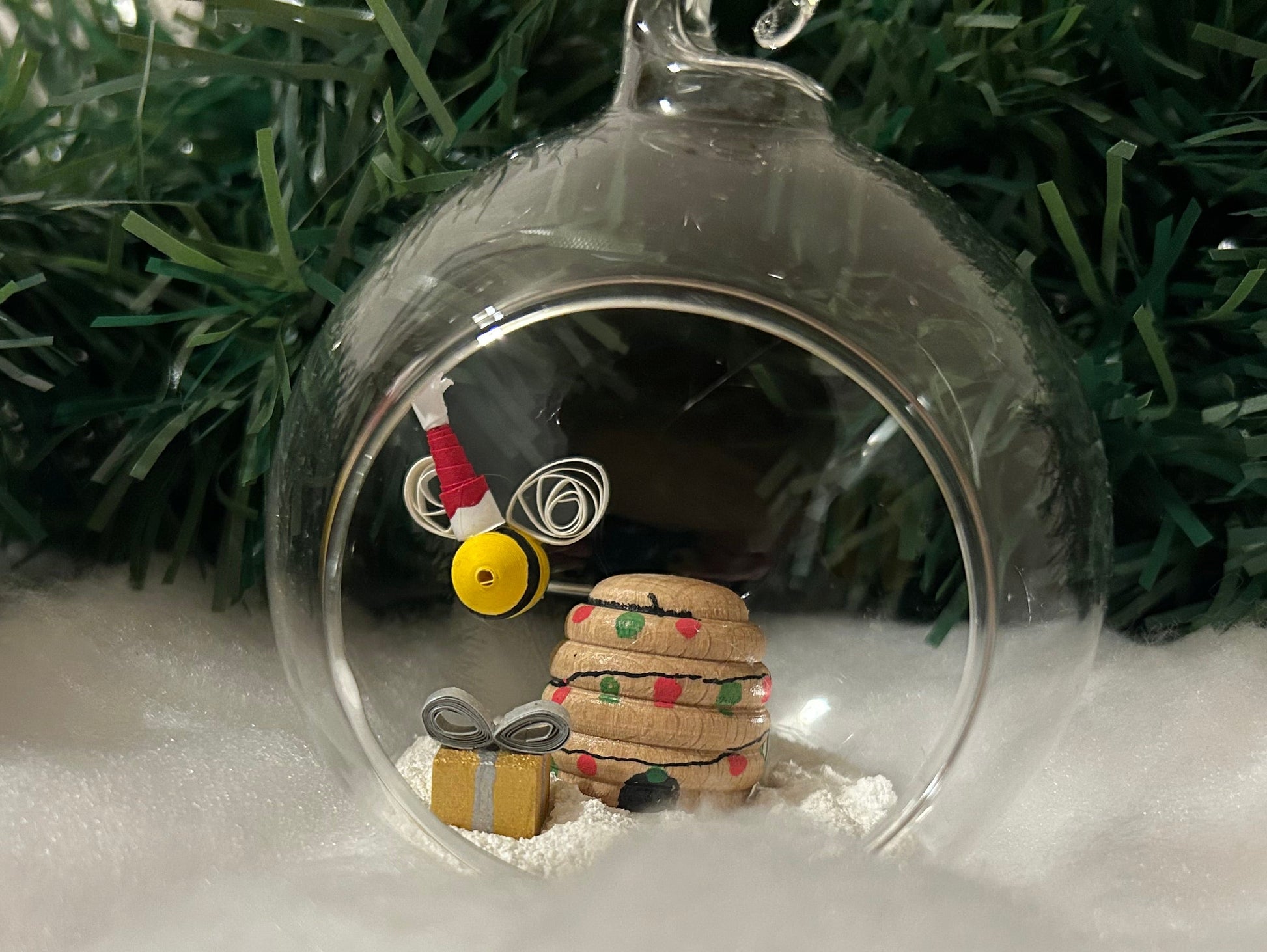 A lovely handmade bee wearing a Santa hat delivering a present to a decorated bee hive in a lovely 8cm glass bauble
